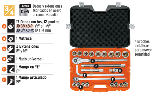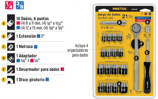 JUEGO DADOS 21 PZS JD-3/8X21SAE-P